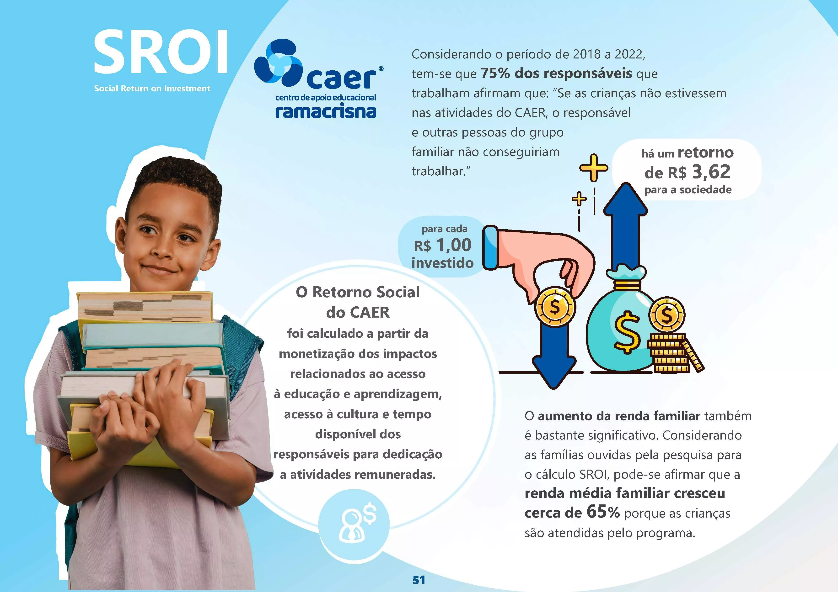 Um exemplo tangível deste impacto é o retorno social do Centro de Apoio Educacional Ramacrisna (CAER), que comprova, em números, o impacto real gerado pelo Instituto Ramacrisna.